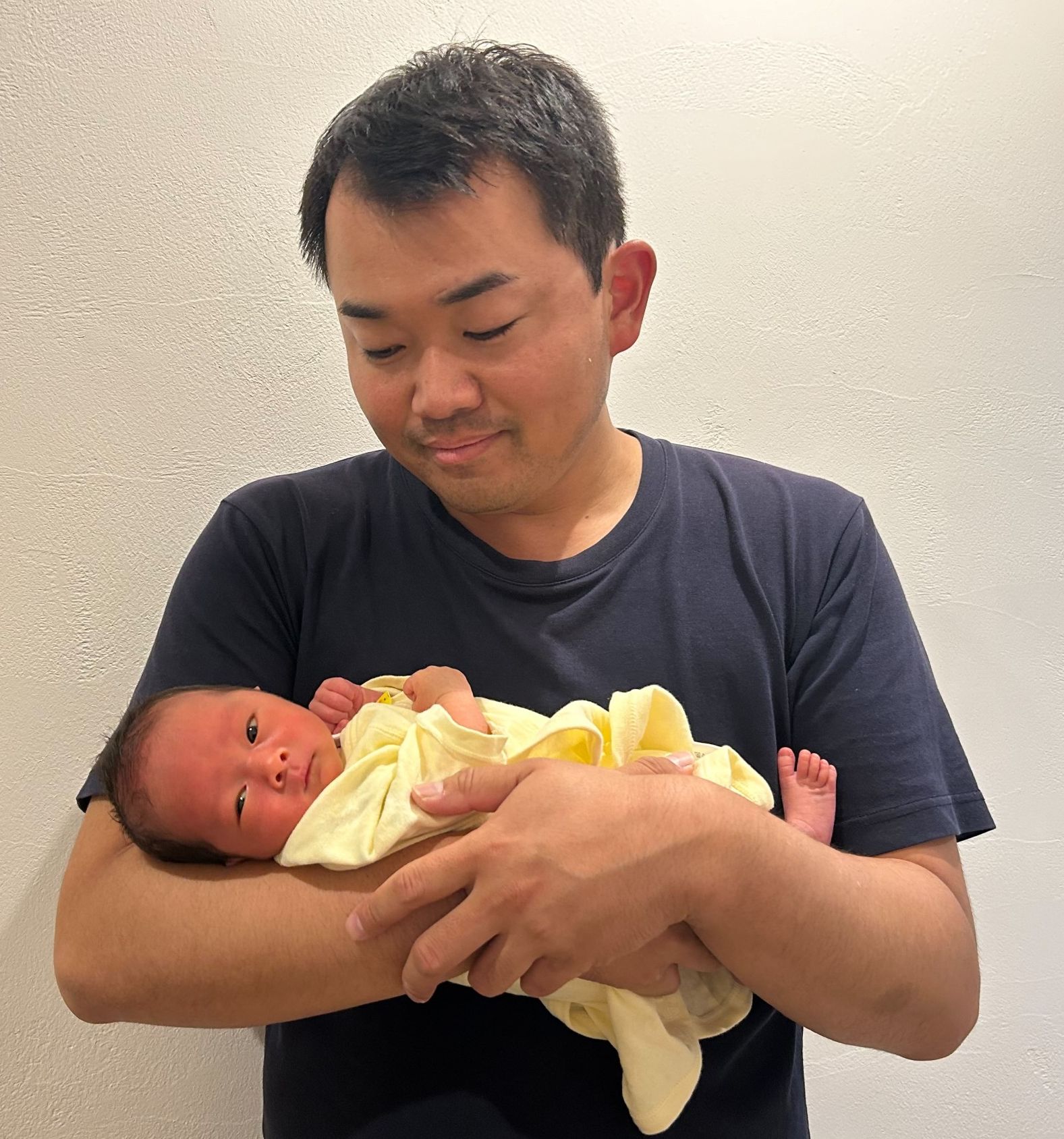 当社としては初めてとなる、産後パパ育休制度で休暇中の社員 松田裕輝君(34)から、無事に出産した男の赤ちゃんを慈しむ様子を撮った写真が届きました。 これを機会に、他の社員も積極的にこの制度を利用して家族の絆を深めて欲しいと願っています。