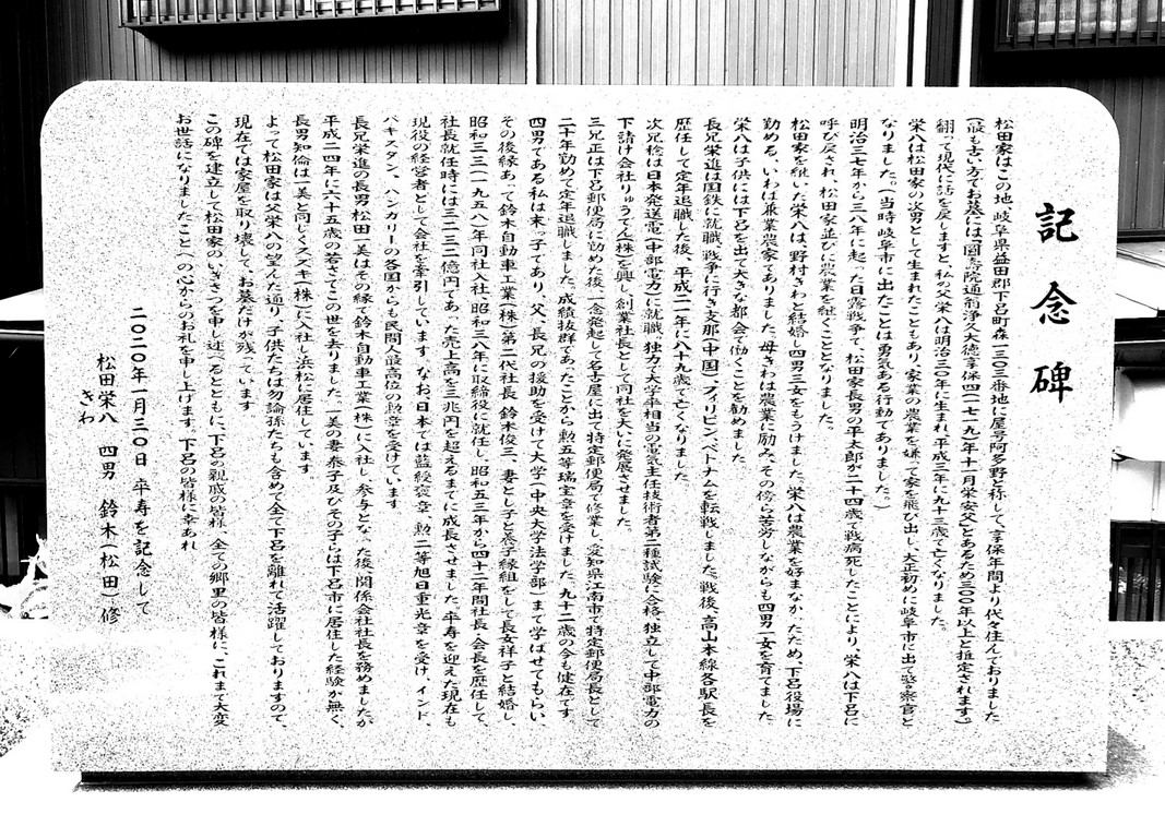 スズキ元会長・社長の故 鈴木修氏が出生地である下呂市の墓所に建てた一族の消息をしたためた記念碑。【