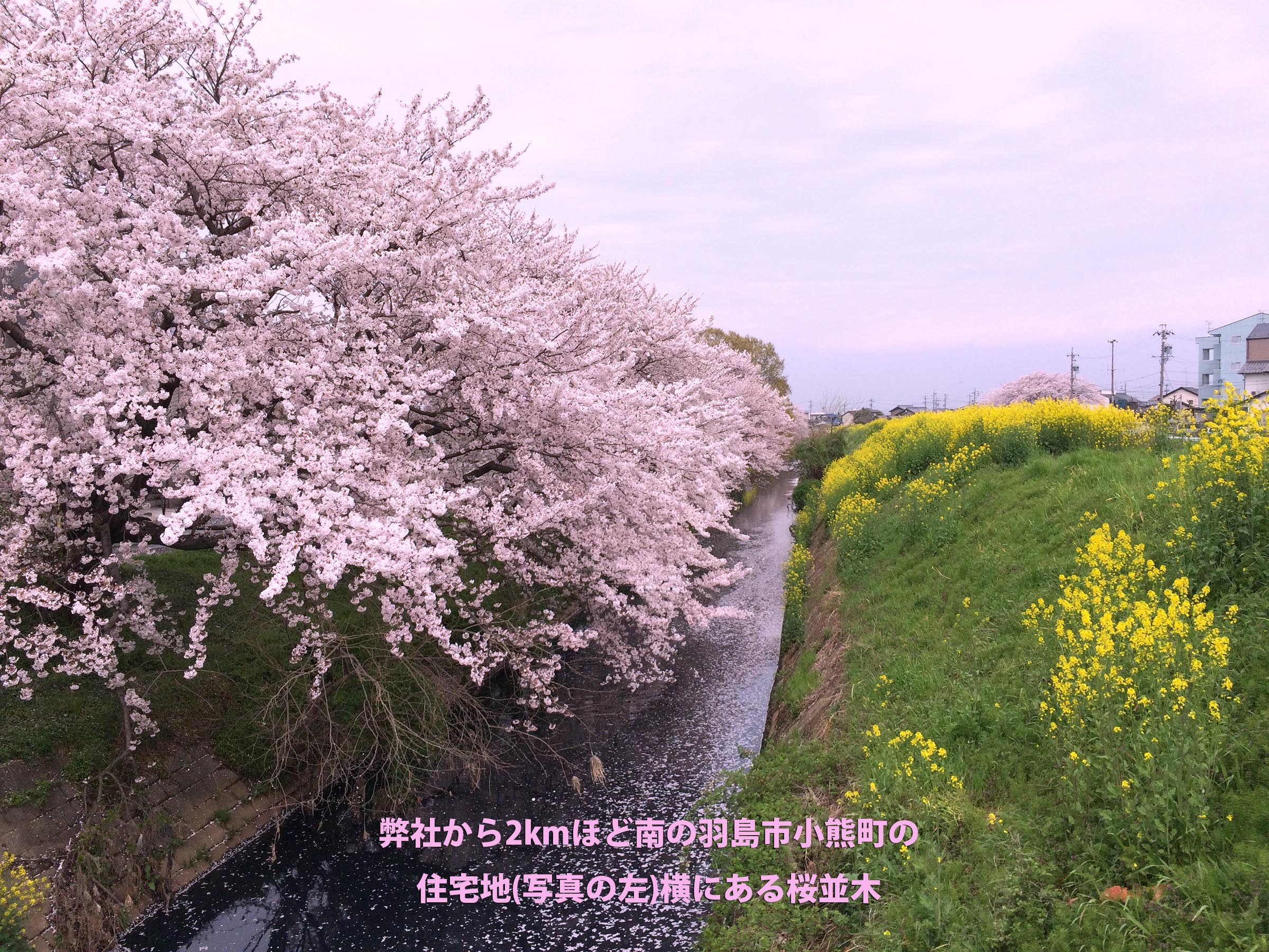 弊社より大垣寄り2kmにある墨俣(すのまた)の桜は有名で、夜にはライトアップされ、屋台も賑やかで多くの見物客が訪れますが、ご近所では境川堤防、羽島市小熊町の住宅地がとてもすてきな風情を醸し出しております。