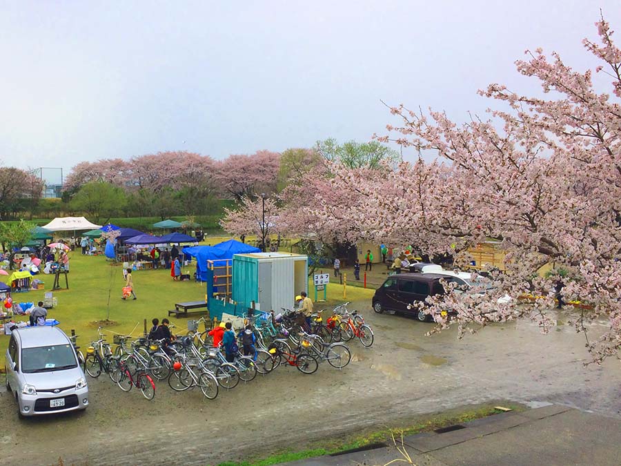 4月7日、小雨がそぼ降る朝方でしたが、花見を兼ねてジョギングに出かけました。徐々に天候も回復し堤防下の河川敷で、地元の町内のイベントが2か所で行われていました。
