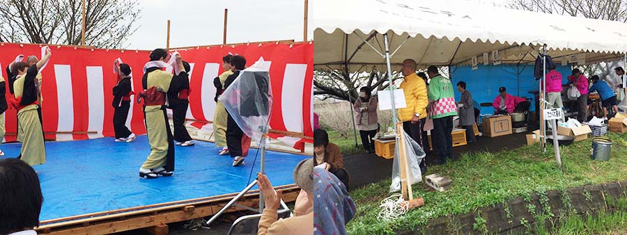 堤防沿いの羽島市高桑地区では、星の形をした”星桜”が有名ですが、星桜音頭を女衆が踊って、集まった人達を楽しませておりました。